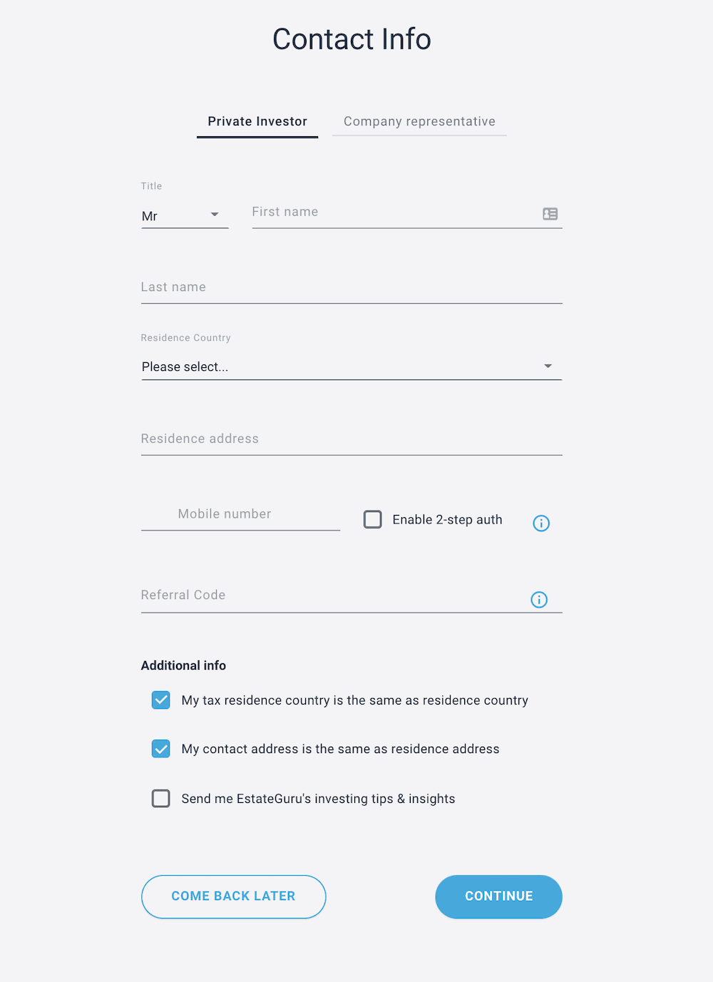 Rekisteröityminen alkaa normaalisti sähköpostin vahvistamisella, jonka jälkeen pääset täyttämään omat henkilötietosi, tai jos sijoitat yrityksen nimellä, voit täyttää yrityksesi ja yrityksen avainhenkilöiden tiedot.