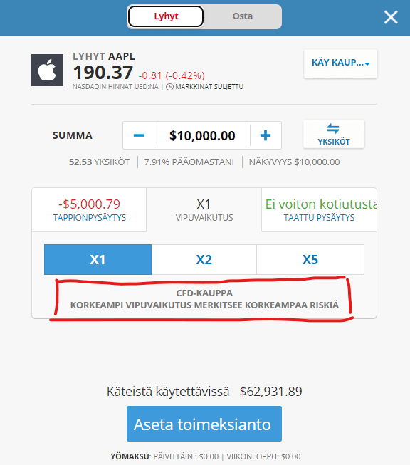 Yllä olevassa kuvassa olen myymässä Applen osaketta lyhyeksi. Nyt EToro ilmoittaa kyseessä olevan CFD-kauppa, ja varoittaa velkavivun käytön nostavan riskitasoa.