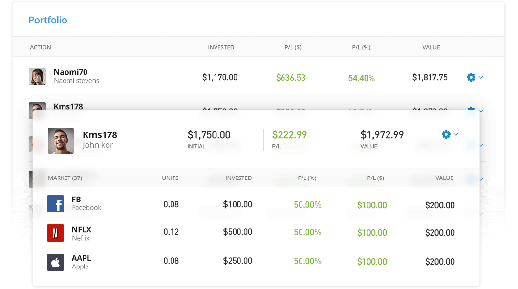 CopyPortfolion avulla voit esimerkiksi automaattisesti sijoittaa samoihin osakkeisiin kuin menestyneimmät sijoittajat. Aina kun kopioimasi sijoittaja tekee sijoituksen tai myy positioita, sama tapahtuu automaattisesti myös sinun salkussasi.
