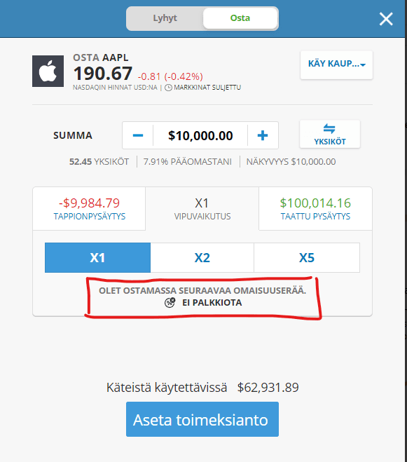 Yllä olevassa kuvassa olen ostamassa Applen osaketta ilman velkavipua. EToro kertoo selkeästi, että olen ostamassa todellista osaketta, eikä kaupasta synny kuluja.