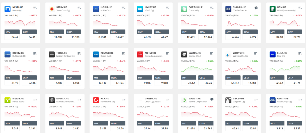 EToron kautta ei löydy kaikkia suomalaisia osakkeita. Kirjoitushetkellä valikoimasta löytyy 21 suuryhtiön osakkeita Suomesta.