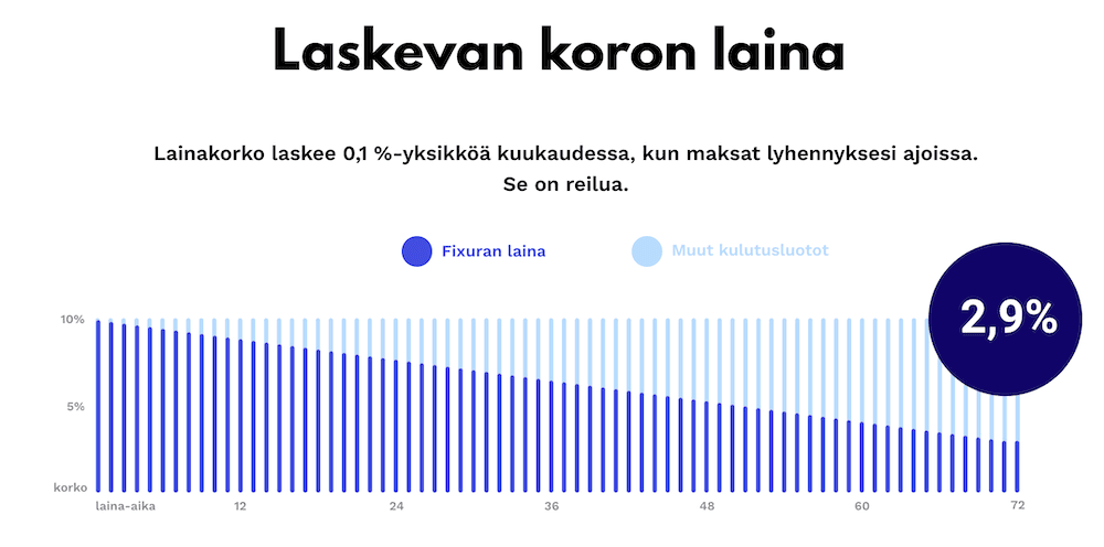 Lainojen suhteen annamme Fixuralle plussaa laskevan koron lainasta, joka palkitsee asiakkaita, jotka hoitavat lainasopimuksen maksut ajallaan.