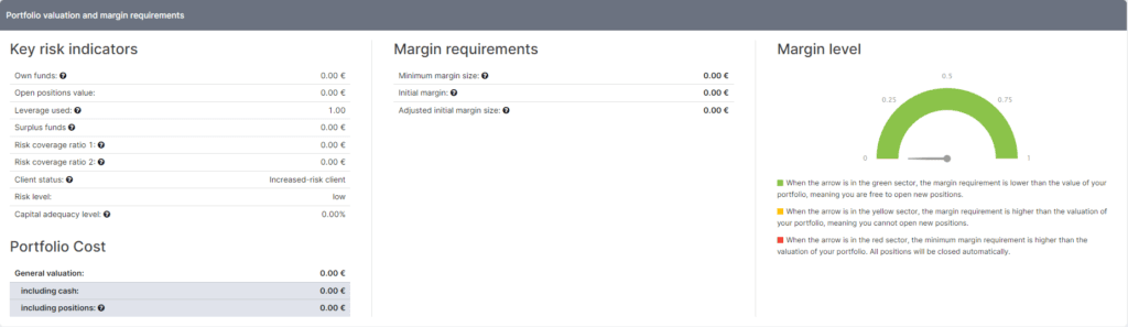Navigoimalla kaupankäyntisivulta "Risks"-välilehdelle, näet oheisessa kuvassa esitetyn näkymän. Näkymän oikeassa laidassa oleva mittari kertoo nykyisen lainoitusasteesi.