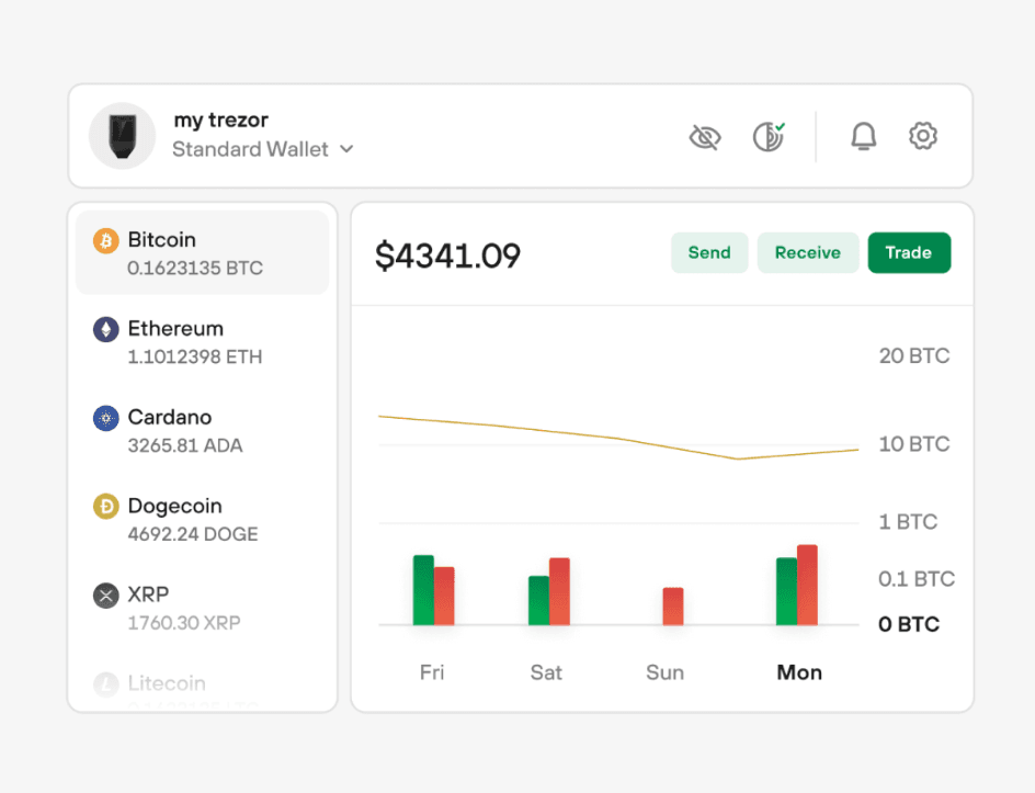 Jokainen Trezor Suitessa tehtävä kryptovaluuttojen siirto on erikseen vahvistettava fyysisestä Trezor-laitteesta.