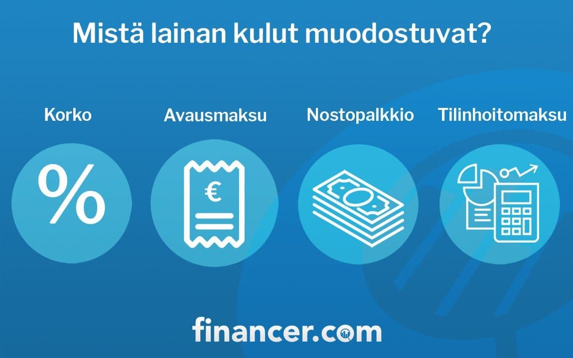 Esimerkki: 15 000 euron laina, nimelliskorko 6,99 %, todellinen vuosikorko 7,9 %. Laina-aika 10 vuotta, avausmaksu 0 €, tilinhoitomaksu 5 €/kk. Tällöin lainan kokonaiskulut ovat 21 490,80 €.