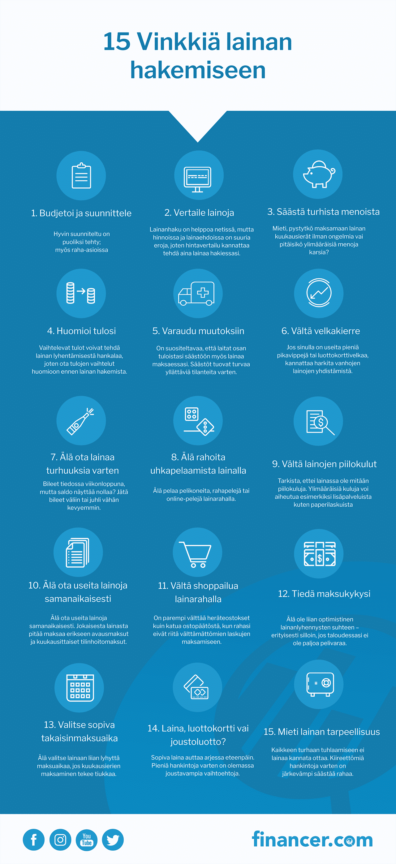 Lainan hakeminen on taloudellinen vastuu. Älä ota lainaa ennen kuin luet tämän artikkelin. Lue 15 vinkkiä lainanhakuun Financer.comista!