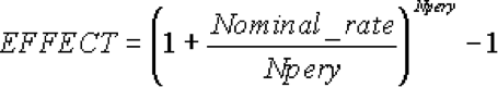 Tämä funktio palauttaa vuosittaisen efektiivisen vuosikorkokannan, kun argumentteina käytetään luoton nimelliskorkoa ja korkojaksojen lukumäärää vuodessa. Ohessa on esitetty kaava, jonka avulla Excel laskee todellisen vuosikoron. Kaavassa käytetyt termit ovat: