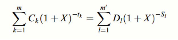 X = todellinen vuosikorkom = viimeisen nostoerän järjestysnumerok = nostoerän numero, joten 1 ≤ k ≤ mCk = nostoerän k määräTk = vuosina ja vuosien osina ilmaistu ensimmäisen nostoerän nostopäivän ja kunkin myöhemmän nostoerän nostopäivän välinen aika, joten t1 = 0m' = viimeisen takaisinmaksun tai maksun numerol = takaisinmaksun tai maksun numeroDl = takaisinmaksun tai maksun määräSl = vuosina ja vuosien osina ilmaistu ensimmäisen nostoerän nostopäivän ja kunkin takaisinmaksun tai maksun maksupäivän välinen aika.