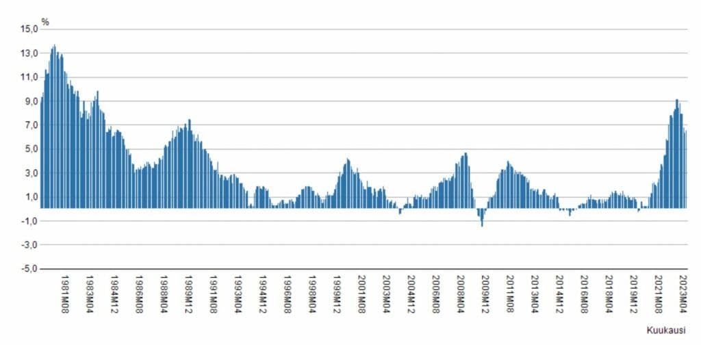 Alla kuvaaja kuluttajahintaindeksin muutoksista vuosilta 1980-2023.