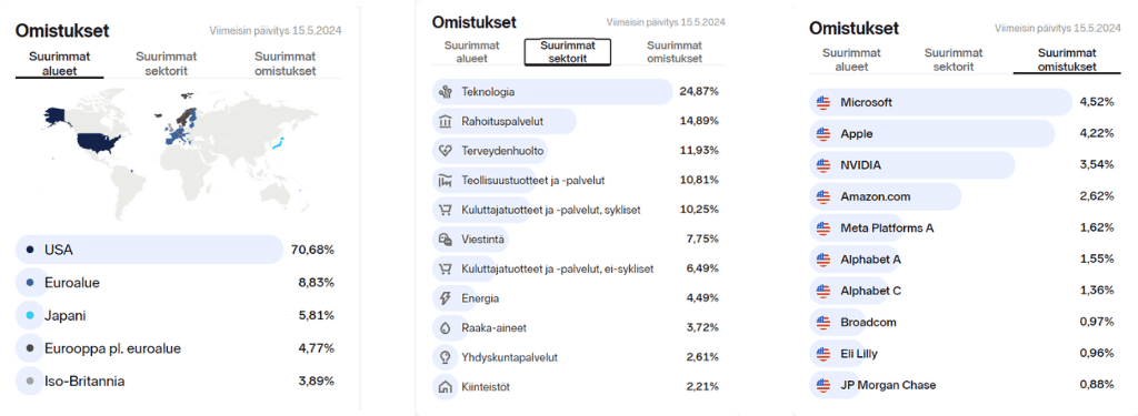Esimerkiksi Nordnet mahdollistaa helposti ETF:ien sisältöön tutustumisen maantieteellisen hajautuksen, toimialan ja yksittäisten omistusten perusteella.