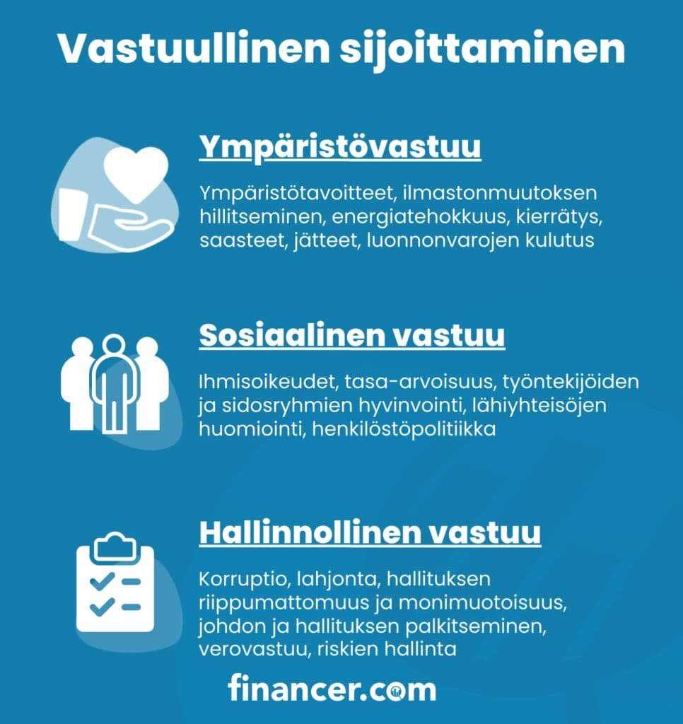 ESG-sijoittaminen viittaa kokonaisuudessaan kestävään ja vastuulliseen liiketoimintaan sijoittamiseen. ESG on lyhenne sanoista Environmental, Social ja Governance, jolla viitataan liiketoiminnan kestävyyden eri tekijöihin.
