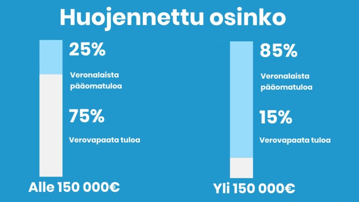 Mikäli edellä mainitut ehdot täyttyvät, on 75 prosenttia osingosta verotonta tuloa ja ainoastaan 25 prosenttia veronalaista pääomatuloa.