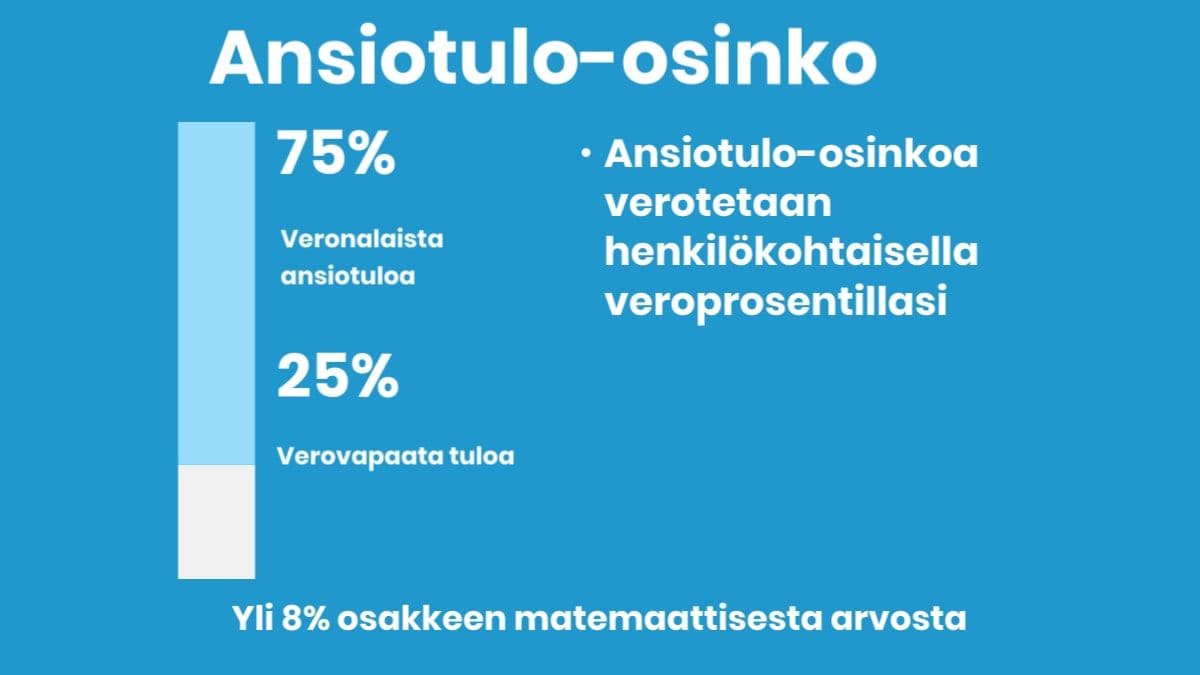 Ansiotulo-osingosta 25 prosenttia on verovapaata tuloa ja 75 prosenttia veronalaista ansiotuloa, jota verotetaan henkilökohtaisen veroprosenttisi mukaisesti.