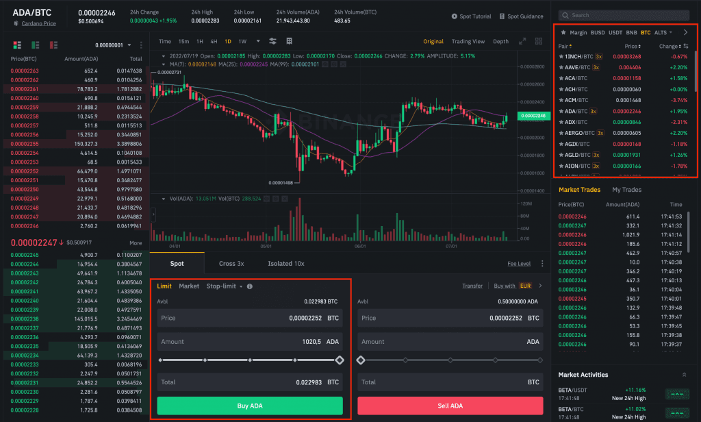 Binance tarjoaa ammattitason työkalut kaikkien asiakkaidensa käyttöön, ja mahdollistaa reaaliaikaisen spot-kaupan sadoilla kryptovaluutoilla.