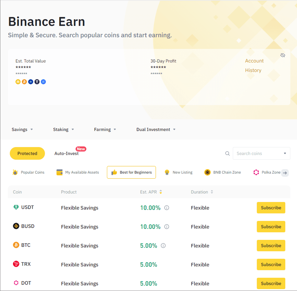 Binance Earn on Binancen korkotuotteet yhteen kokoava osasto, jonka avulla voit saada kryptovaluutoillesi passiivista tuottoa.