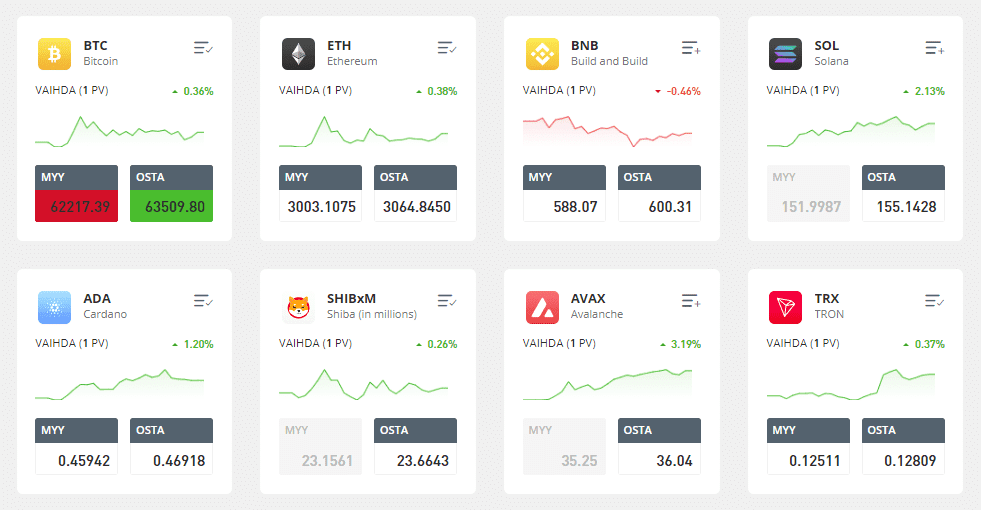 Huomioithan myös, että monia kryptovaluuttoja ei ole mahdollista myydä lyhyeksi. Kryptovaluuttoja ei myöskään ole mahdollista ostaa vivutettuina.